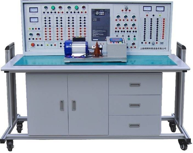 变频器实训装置由控制屏、实训桌、变频实训组件、继电接触实训组件、数字量/模拟量输入输出给定指示组件、三相异步电机、电机导轨、测速机构等组成。