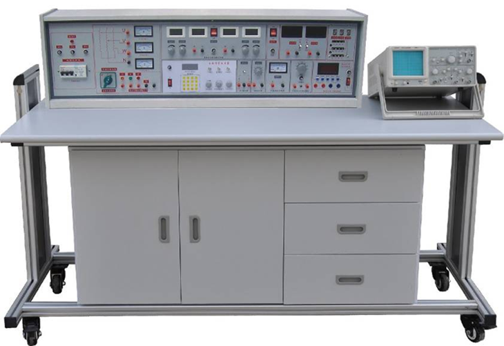 电工实验台具有较完善的安全保护措施,较齐全的功能。实验操作桌中央配有通用电路插扳,电路板由进口ABS注塑而成,背面装有压铸而成九孔成一组的铜片,表面布有九孔成一组相互联通的插孔,创新实验元件模块在其上任意拼插成实验电路。实验元件制成透明创新模块,直观性好,盒盖印有永不褪色元件符号,线条清晰美观。盒体与盒盖采用较科学的压卡式结构,维修、更换元件拆装方便。元器件放置在实验操作桌下边左右柜内,实验时取存方便,大大提高了管理水平,规划化程度,大大减轻了教师实验准备工作。