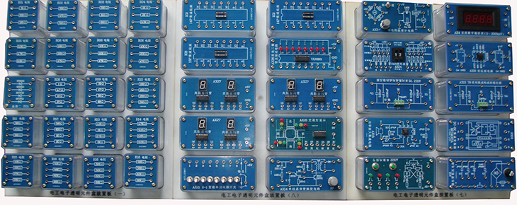 提供电工电子透明实训模块,可以完成直流电路、模拟电子技术、数字电子技术和电子综合应用实训项目。实训模块面板采用PCB板制作而成,器件和信号接口均已引至板上的专用插座,实训模块有四个弹性插脚,与专用实训孔板配套使用。