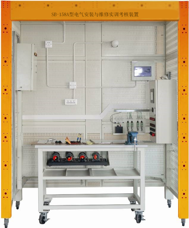 电气安装与维修实训考核装置,采用钢制网孔板和钢制专用型材组接而成,安装有自锁式脚轮,方便移动和使用。装置表面喷塑,色彩稳重。装置配有专用电源台。装置设计高度以人站在一级人字梯即可方便操作的高度,既安全又能使使用者感受到施工现场环境。横向、丛向宽度合适,可以模拟现场线路的转向布置。网孔板可以方便拆下。为方便隐蔽工程施工,钢制框架仿建筑隔断用轻钢龙骨的加大宽度精心设计,带有穿管孔,使用扎带固定线管,在穿出网孔板时可以使用壁疏引出导线穿入明装底盒。配套的PVC管弯管器,可方便的对PVC管弯成90度。钢制镂空方形樑骨的使用,使该装置结构牢固,外形美观,便于连接,更主要的是能实现暗管掩引等技术的真实操作,并实现两套,四套设备的联合使用。★新型电源控制模块,结构精巧,功能强大,配置有电源指示,三相漏电保护,紧急停止开关,安全插座引孔,与装置竖梁完美衔接,作为设备入线控制,让设备的安全系数再次提升了一个等级。★挂板支架的设计,让挂板安全牢固的安装于设备上面,不占用空间,挂板可随时更换,搭配机床智能考核装置,让装置的功能进一步的得到发挥。