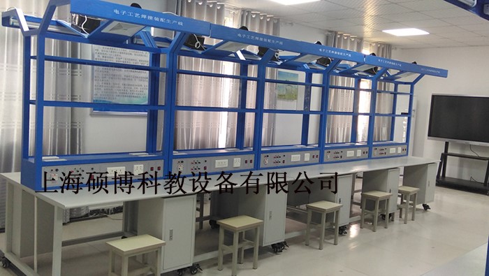 3.经济性此实训台为2人座,装有照明日光灯、看板(用来夹资料)、仪表台、插座,2个抽屉。学生在这里可以仿真生产过程(如:工艺流程的编制、线路板的焊接、线路板的调试、整体产品的组装),组装后的装配线安全、可防静电。