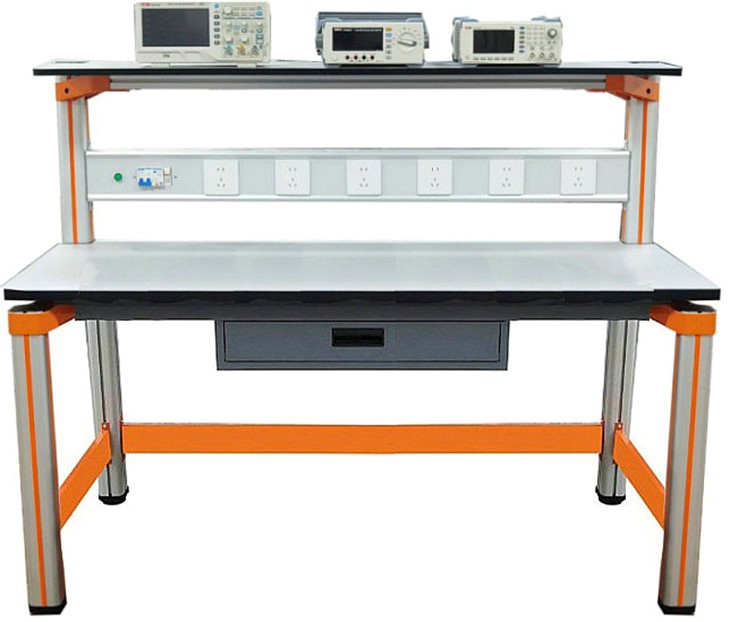 (三)实训桌结构:实训桌规格为1600(长)*700(宽)*1300(高),设有一个抽屉;实训桌主体结构全部采用高性能表面氧化的铝型材及一次成型铝压铸框架连接构件,连接构件采用压铸成型工艺(非焊接工艺),经机加工、抛丸、喷砂,表面静电喷涂工艺,安装方便、快捷,用户可自行DIY组装。桌体立柱采用工业铝型材成型工艺,表面氧化处理,截面尺寸:70mm×70mm,四面带槽,槽宽约8mm,端部装有注塑成型配套塑料堵头。桌面采用25mmE1级三聚氰胺饰面板,桌面板下设支撑框架,承受力不少于200kg。配备储存柜,存放元件及工具,储存柜底部4只高强度万向可制动PU脚轮,方便移动。实训装置整体简约不简单,高端大气,符合现代化产品审美和发展趋势。