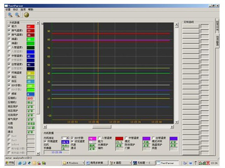 2)、软件控制,能在线控制系统的温度,读取机组在最佳温度系统制冷冷媒的流量开度数,调整制冷机组的过热度,过冷度。该文本显示界面的左侧,以文本的形式实时显示当前机组的运行数据。在界面右侧的上半部分,是对通讯信息的显示,包括通讯角色及通讯端口的设定值以及对当前通讯状态的显示。在界面右侧的下半部分"数据信息"中,显示当前接收到哪种数据帧、接收到的数据帧的地址、等信息。具有上位机调节的线上和手动调节功能: