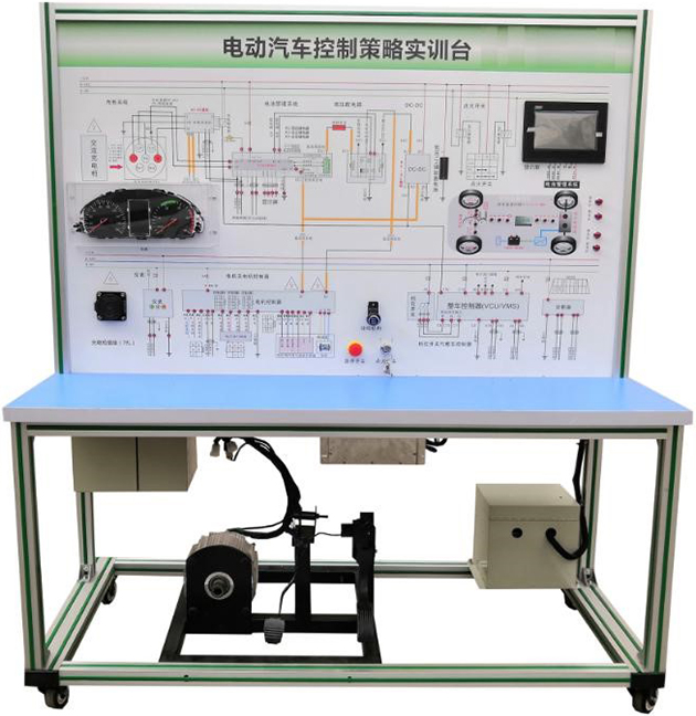 纯电动汽车电控系统教学平台采用纯电动车控制策略系统(包含电机控制、电池管理、VCU控制、车载充电机、电源转换系统、高压安全系统)的真实器件制作,包含电池及管理系统、电机及控制系统、车载充电系统、整车控制器VCU及控制系统、电源转换系统(AC-DC模块、DC-DC模块、DC-AC模块)、高压安全系统,真实展示电动汽车控制策略系统的结构原理与工作过程,纯电动车控制策略系统动力性能、可靠性能、安全性能。实现控制策略演示验证操作,包括起步模式、正常驱动模式、能量管理策略、安全控制策略以及其他情况下的控制策略等,并对控制策略进行检测分析诊断。