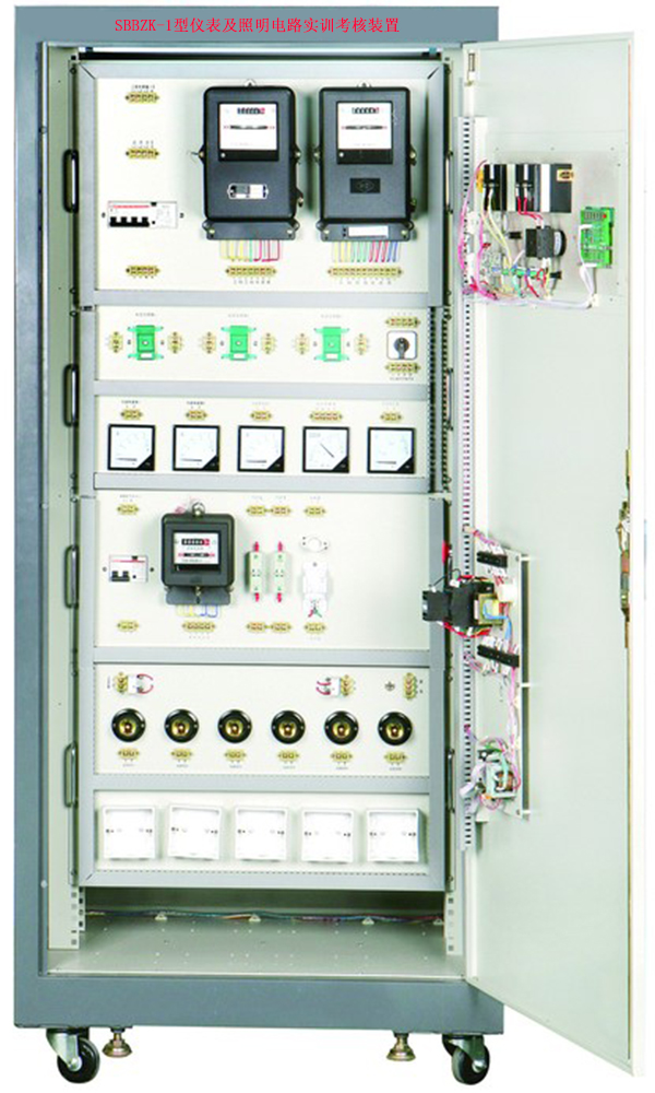 仪表及照明电路实训考核装置是按照劳动和社会保障部颁发的"工人等级标准""职业技能鉴定"规范要求而设计的,它集培训、理论、实际操作和考核鉴定为一体的多功能设备。该装置采用实际应用的配电柜为主体,合理利用柜体的双面空间,进行合理布局,配置可靠的元器件。它既可用于对电工仪表和照明电路的操作实训。也可作为初、中、高级电工技能考核设备。