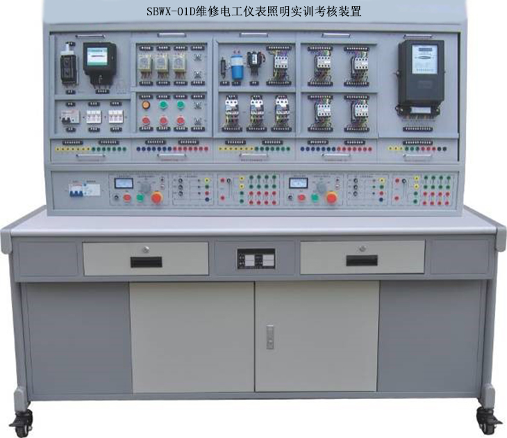 电工工艺及照明电路安装技能实训室,维修电工仪器仪表照明电路实训考核装置,仪器仪表及照明电路实训装置(柜式、两面双组型)电气基本技能实训室为机电技术应用专业重点实训室。电气基本技能实训设备的功能是《电工》职业技能“照明电路安装调试和器件的拆装”模块的培训和鉴定,侧重于室内照明电路安装调试和变压器、电动机、接触器等器件的拆装测试技能的训练。配备技能实训考核装置,其拥有各种实训组合板和实训器件满足学生实训,接线直观,拆装测试一体化,极大地帮助学生提高了动手操作能力和感性认知水平。承担电工鉴定(五级)---电气拆装模块、照明电路安装调试和排故模块。