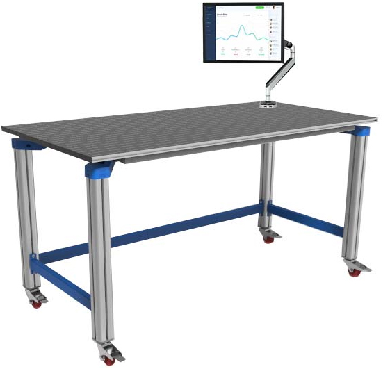 1)采用工业铝合金型材框架设计,台面为铝合金型材操作板,单根型材截面20×80mm,型材槽间距40mm,桌脚截面70×70mm