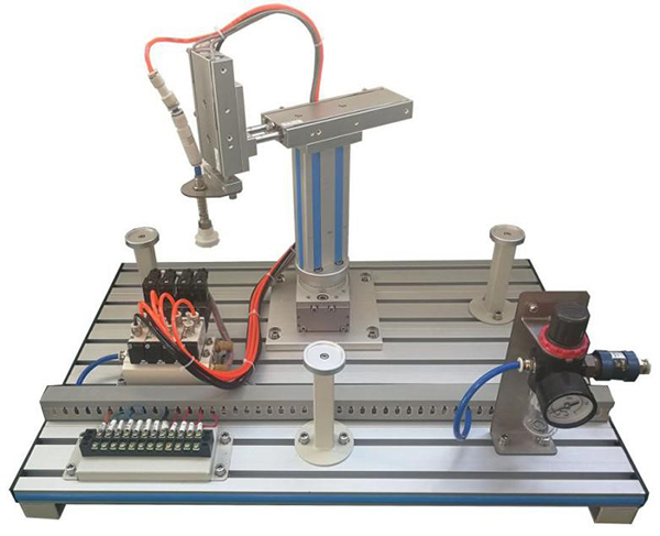 模型由回转气缸、双轴气缸、单轴气缸、吸盘、真空发生器、电磁阀、节流阀、手滑阀、减压阀、磁性开关、机械部件、工业铝合金型材底板等组成,设有两个抓取工位,可进行工件取放控制练习。可开展对气动机械手的操作及编程控制训练。配有空气压缩机:静音无油,工作电源AC220V±10% 50Hz,输入功率0.68kW;公称容积24L,理论流量:116L/min,额定输出气压0.7MPa