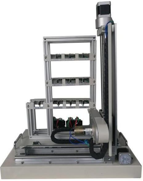 模型包含三层九仓位库体、出/入库仓位库体、三维(XYZ)运动机械及电气控制等部分组成;定位执行机构由竖轴和横轴组成;驱动机构由步进电机及步进电机驱动器组成;传动轴为滚珠丝杆传动和双轴导轨带传动,传动平稳。取物轴由直流减速电机驱动,可实现前后两方向的运动。