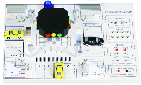 模型以实际十字路口按一定的比例微缩而成,配有道路模型、交通指挥灯、电气控制接口区域等。具有指示和控制、启/停按钮、手/自动按钮、行人呼叫按钮、四方向红//绿灯指示等功能。