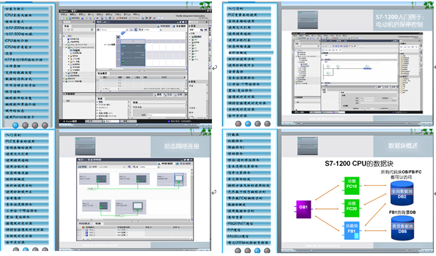 配有S7-1200 PLC学习软件,方便老师教学,提供有功能与特点、模块安装、选型、工作原理、支持的数据类型、数据的存取方式、程序结构、编程软件的安装、编程软件界面介绍、硬件的组态、入门实例、PLC变量表的使用、使用交叉引用、组织块使用示例、基本位逻辑指令、上升沿-下降沿指令、置位-复位指令、接通延时定时器、比较指令、移位-循环移位指令、基本逻辑运算指令、数据块概述等50多个学习项目。PLC学习软件参考界面如下: