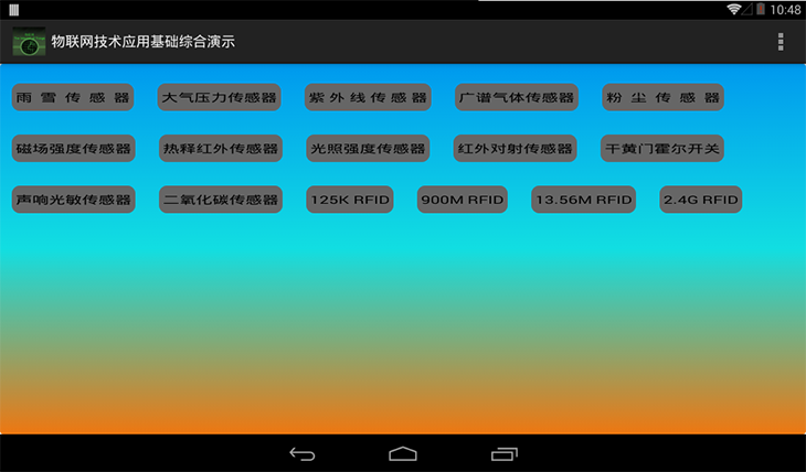 3、基础学习单元:基础学习单元提供一套Zigbee无线传感网系统、RFID射频识别系统、感知执行器控制系统,搭载着二氧化碳、光照强度、声响/光敏监测、大气压力、粉尘、紫外线、红外对射、雨雪、磁场、热释红外、广谱气体、干簧门磁/霍尔开关等传感器以及配套智能网关传感器数据采集系统,学生可以对无线传感网技术进行学习并自行开发构建综合的无线传感网系统,例如智能家居系统、智能农业系统、图书管理系统、ETC不停车收费系统、地铁闸机收费系统等。