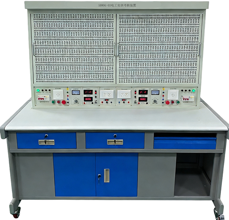 2.实训桌桌面采用防火、防水、耐磨高密度层压板封边特制(厚度≥25mm),有效提高绝缘等级。实训桌采用工业型材或铁质双层亚光密纹喷塑结构,桌架底部设计至少有四个脚轮,方便实训台架移动(两个定向,两个万向带刹车)。桌子设有二个抽屉(带锁)用于置工具及资料,边上设有键盘电脑联体设计、下方设有储存柜放置模块和实验导线。3.网孔板2块:尺寸700mm×600mm、厚度1.5MM,采用数控冲床精加工而成,网孔分布合理、均匀。孔径统一,可在上面安装的元气件包括各类低压电气、PLC、单片机、变频器、触摸屏等。网孔板配置若干只与椭圆形孔匹配的塑料卡件,用于固定实验用相关电器元器件,以便各器件的拆装方便。网孔板为挂件式,实训时挂在控制屏的上,可方便拿下,有利于元件件的安装和布局。