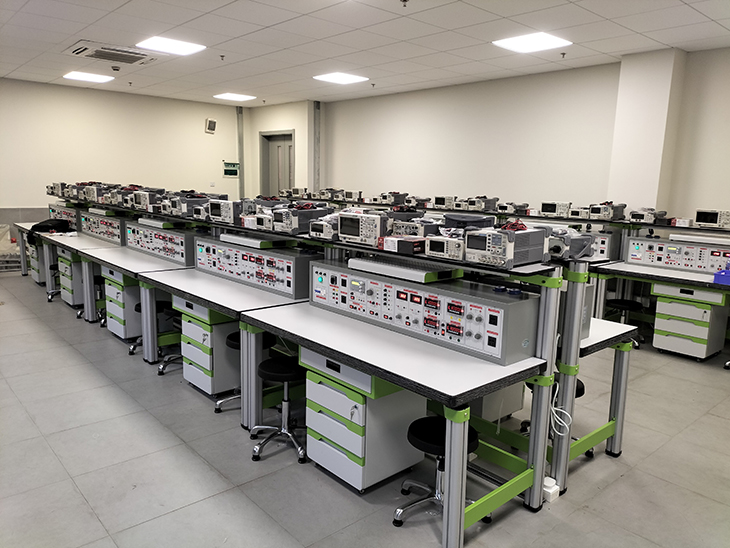通用电工、电子技术实训装置,电工电子技术实训平台用于电工基础理论验证性实验教学和电工基本操作技能训练。以培养学生理论联系实际,分析、解决问题的能力和实践动手能力。实训台具有较完善的安全保护措施,较齐全的功能(详见实训台结构简介)。实训桌中央配有通用电路板,电路板注塑而成,表面布有九孔成一组相互联通的插孔,元件盒在其上任意拼插成实训电路,元件盒盒体透明,直观性好,盒盖印有永不褪色元件符号,线条清晰美观。盒体与盒盖采用较科学的压卡式结构,维修拆装方便。元器件放置在实训桌下边左右柜内,大大提高了管理水平,规划化程度,大大减轻了教师实训准备工作。