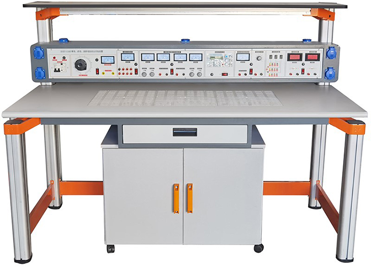 模电、数电、高频电路综合实验台具有较完善的安全保护措施,较齐全的功能(详见实验台结构简介)。实验桌中央配有通用九孔万能插件板,九孔万能插件板主体由ABS注塑而成,表面布有九孔成一组相互联通的插孔,九孔万能插件板内部内嵌126组铜质九孔一体成型嵌件。实验中的弱电模块必须以独立封装的透明元件盒为单一模块,元件盒统一都能配合九孔万能插件板像搭积木一样的形式自由搭建组合电路,元件盒盒体透明,内装元件直观性好,盒盖印刷电路图防刮耐磨,符号美观清晰。元件盒盒体与盒盖采用较科学的压卡式结构,维修拆装方便。元器件放置在实验桌下边储存柜内,大大提高了管理水平,规划化程度,大大减轻了教师实验准备工作。