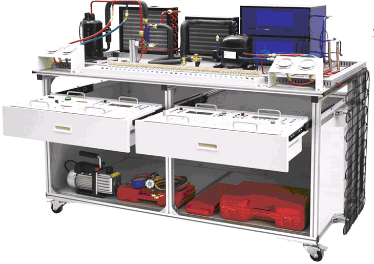 制冷制热实训考核装置是专门为职业院校制冷类相关专业而研制的实训装置,根据制冷类行业中空调与冰箱维修技术的特点,针对空调和冰箱的电气控制以及制冷系统的安装与维修进行设计,强化了学生对空调冰箱系统管路的安装、电气接线、工况调试、故障诊断与维修等综合职业能力。装置融合了流体力学、热力学、传热学和电气控制等技术,集制冷空调系统安装、冰箱系统安装、制冷系统电接线、压力检漏、抽真空、充注制冷剂与运行调试于一体,包含了制冷系统维修的全部步骤,能满足实训教学、实际工程训练及职业技能竞赛的需要。