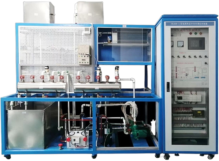 空气调节系统由、模拟房间、风机盘管、中央空调控制器、阀门,一台水泵、不锈钢换热器组等组成,主要完成空气调节作用。(室内送风风机转速可调),主要完成制冷机组冷却热交换,为室内提供适当的温度