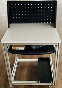 钢铝结构,装有4只万向轮,装有黑色钢质网孔电脑后靠、键盘托、主机支架。