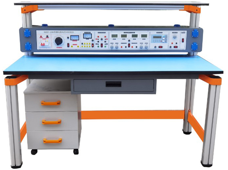 模电数电技术实验台具有较完善的安全保护措施,较齐全的功能(详见实验台结构简介)。实验桌中央配有通用九孔万能插件板,九孔万能插件板主体由ABS注塑而成,表面布有九孔成一组相互联通的插孔,九孔万能插件板内部内嵌126组铜质九孔一体成型嵌件。实验中的弱电模块必须以独立封装的透明元件盒为单一模块,元件盒统一都能配合九孔万能插件板像搭积木一样的形式自由搭建组合电路,元件盒盒体透明,内装元件直观性好,盒盖印刷电路图防刮耐磨,符号美观清晰。元件盒盒体与盒盖采用较科学的压卡式结构,维修拆装方便。元器件放置在实验桌下边储存柜内,大大提高了管理水平,规划化程度,大大减轻了教师实验准备工作。