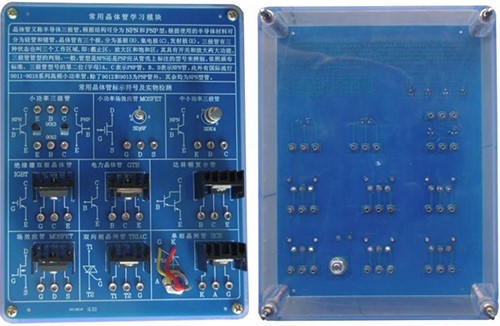 底盒使用190mm×145mm的开模有机透明塑料底盒,模块面板采用印制电路板PCB工艺,可以直观看到器件的实物及相关的原理介绍。对于典型应用及易损器件安装在面板背面,透过透明底盒能够看到器件实物,方便感性认识、检测测试,同时也能防止器件的损伤。