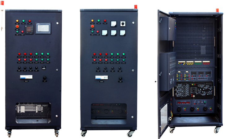 现代电气控制系统实训考核装置。是由实训柜体、门板电气控制元件(组件)、仪表等,实训考核单元挂板、网络组态挂板、PLC控制型机床挂板、电机单元、运动单元、温度控制组件、网孔挂板等组成。