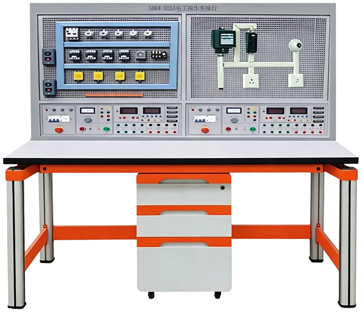 电工实训实操台,电工操作实操台,维修电工实训操作台,网孔型电工技能实训考核装置、电工技能实训台、电工操作台、电工实训装置、电工技能实训室设备主要承担电气自动化技术、工业机器人技术、应用电子技术、移动通信技术、机电一体化技术、汽车电子技术、建筑电气工程技术等相关专业课程的课内实验、课程设计、毕业设计等实践实训教学任务,可作为“教、学、做”一体化教学任务上课所用教室。电工技能实操台主要实践内容包括认识安全用电、认识与使用工具和仪表、电工基本操作技能、室内电气线路操作技能、认识和使用常见低压电器和三相异步电动机、电气控制线路的操作、安装输电线路等,可完成三相异步电动机直接起动控制、双重联锁的三相异步电动机正反转控制线路、三相异步电动机的顺序控制、触摸开关控制白炽灯线路、单相电度表的安装线路等23个实验项目。