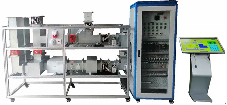 装置心4040铝材为主体框架,尺寸:长2500MM*500MM*2000MM,框架内包含新风井(模拟)、排风井(模拟)、新风机、回/排风机、排烟风机、电动调节阀、电动排烟防火阀、自动防烟防火阀、通风管路、相关传感器以及就地控制柜等。充分地展示了空调通风(防排烟)系统结构形式、控制原理。系统主要组成由下面几个部分组成