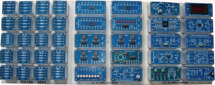 提供电工电子透明实训模块,可以完成直流电路、模拟电子技术、数字电子技术和电子综合应用实训项目。实训模块面板采用PCB板制作而成,器件和信号接口均已引至板上的专用插座,实训模块有四个弹性插脚,与专用实训孔板配套使用。