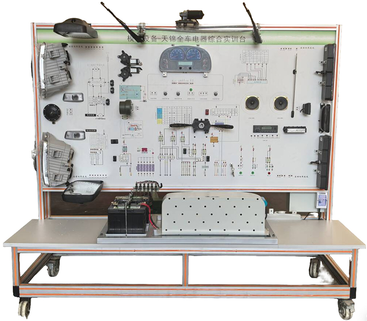 天锦全车电器(综合系统)实训台以东风天锦运输车配备的全新电器系统为基础制作电器实训台。实训台检测面板和电器实物混合在电路图中,可模拟原车的工作原理与电路布局。实训台可适用于车辆培训机构对汽车电器系统构造与维修实训教学,能够满足对汽车电器系统的结构、工作原理、故障设置及诊断的教学需要。