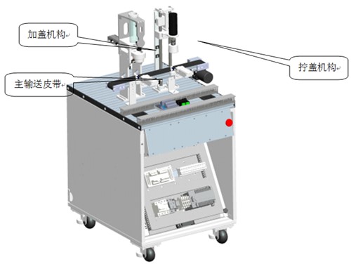 接收上一工作站填装好颗粒的瓶子,当瓶子被输送到加盖机构后,主输送皮带停止,夹盖定位夹紧机构将瓶子固定,加盖机构启动加盖流程,将盖子加到瓶子上;加好盖子后主输送皮带启动,加上盖子的瓶子继续被送往拧盖机构,到拧盖机构下方,主输送皮带停止,拧盖定位夹紧机构将瓶子固定,拧盖机构启动,将瓶盖拧紧,主输送皮带启动,将拧好盖子的物料瓶输送到下一工位。瓶盖分为白色和黑色两种。