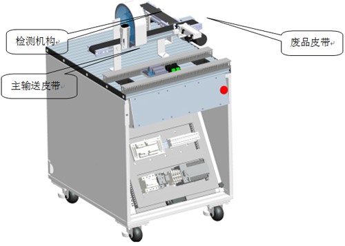 主皮带运行,接收上一站拧好盖后的物料瓶子,当物料瓶经过检测机构时:回归反射传感器检测瓶盖是否拧紧;检测机构检测瓶子内部颗粒是否符合要求;对拧盖与颗粒均合格的瓶子进行瓶盖颜色判别区分;拧盖或颗粒不合格的瓶子被分拣机构推送到废品皮带上(短皮带);拧盖与颗粒均合格的瓶子被输送到皮带末端,等待机器人搬运。