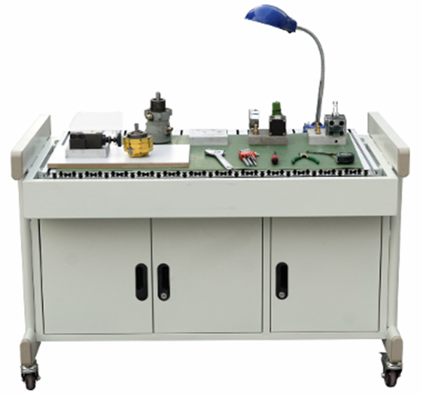 6、实训台:采用钣金结构设计,表面为双层亚光密纹喷塑工艺处理,台面采用下凹设计,增加台虎钳,以及绝缘防滑垫,同时为液压阀拆装时提供一个良好的接油、防震平台。