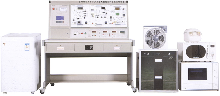 实训挂件由电子电风扇、微电脑控制电饭锅、微波炉、电子消毒柜、全自动洗碗机、全自动洗衣机等组成。挂件均可设置故障点、完成排除故障等实训内容。