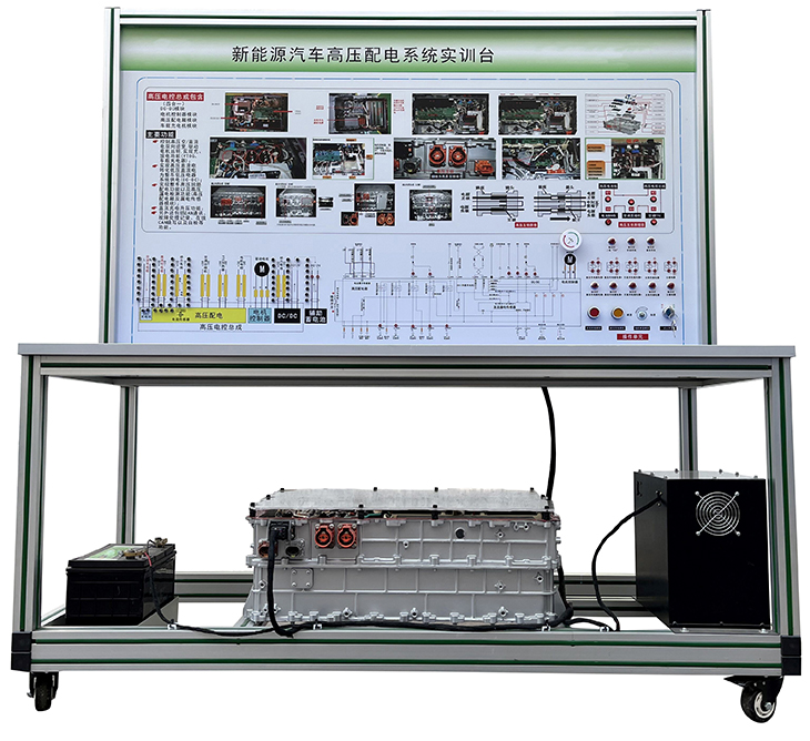 动力电池组带电池箱(24V20AH)、国标充电枪与充电座、(比亚迪E5)高压配电箱(带各类高压继电器)、漏电传感器模块、绝缘传感器模块、安全维修塞模块、漏电模拟操作单元、高压安全系统操作单元、操作控制台、训练控制按钮、直流接触器(包含充电继电器、总正继电器、总负继电器、预充继电器)、辅助蓄电池(12V45AH)、一体化全铝合金型材搭建的移动台架(1500×700×1700mm