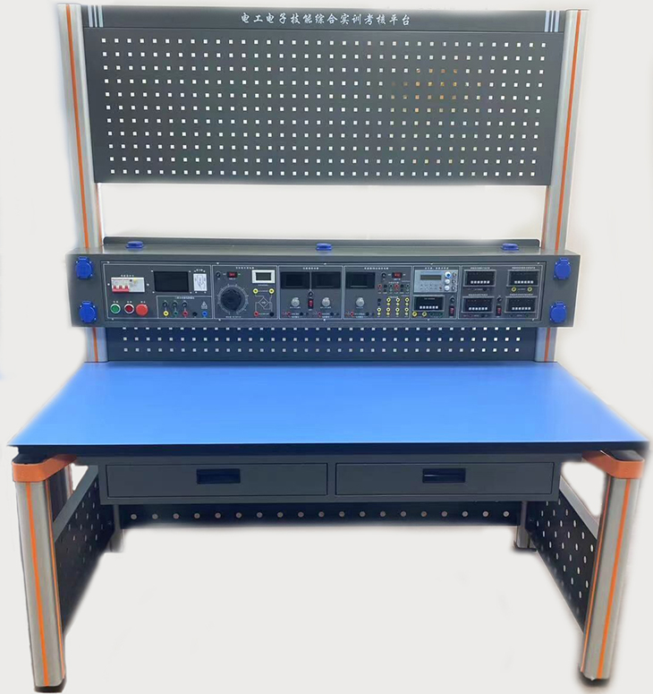 电工电子技能综合实训装置由实验主机箱、仪器架、实训桌、移动矮柜、电工电子实训套件、学生凳等组成。实验装置支架与实验桌可组合、可拆装。支架与桌脚一体,铝合金结构。