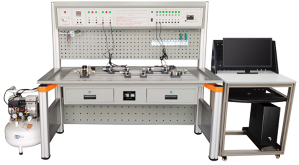 实验台由实验桌、实验操作区、网孔工具挂板、静音气泵、常用气动元件、主控机箱、电脑桌等几部分组成。