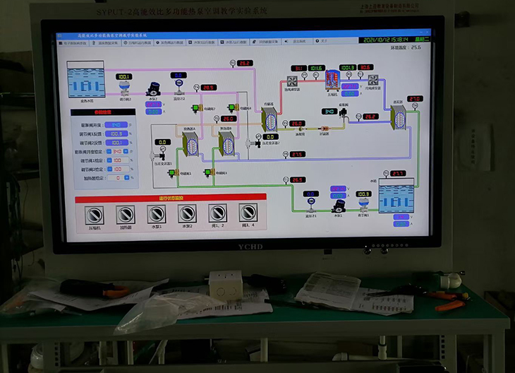 *14、50寸高精度触摸屏一体机及控制开发软件,可进行教学演示和实验模式控制,并实时显示系统温度、压力、差压、流量、功率等数据,计算系统能效比和制热量等参数。